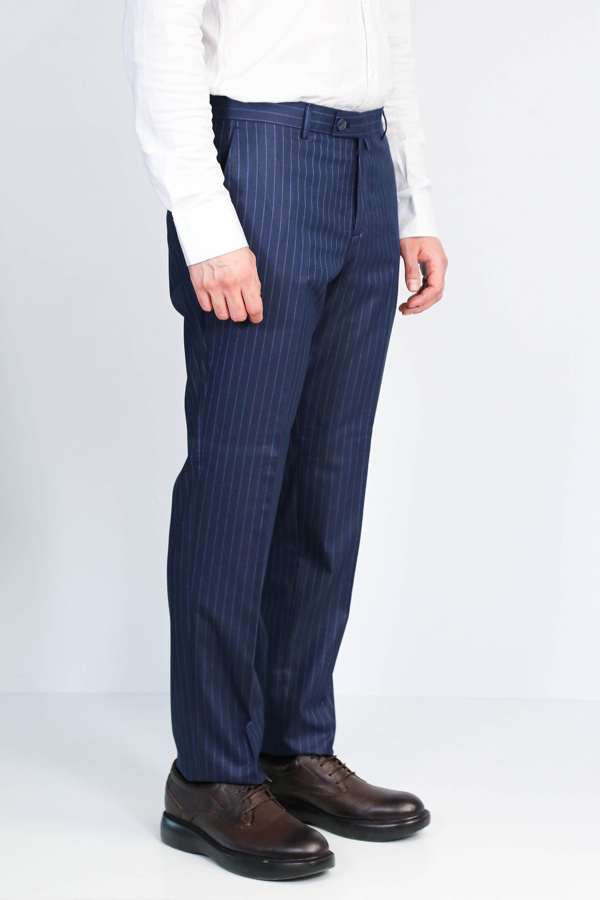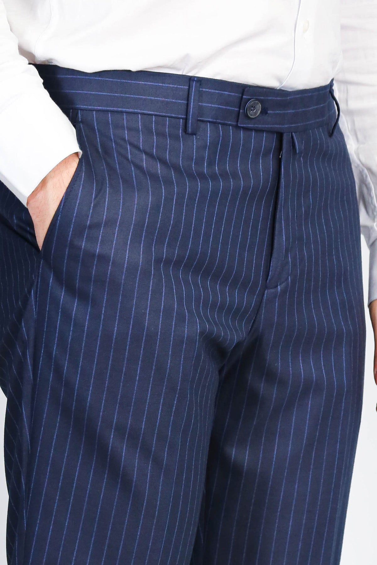 İnce Çizgili Desen: Sade lacivert pantolonlardan farklı, dinamik ve modern görünüm.
