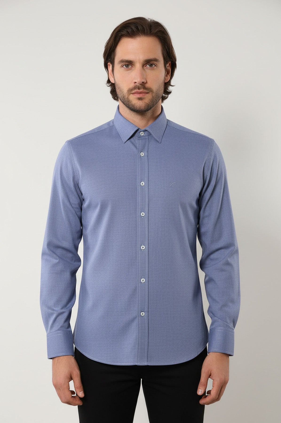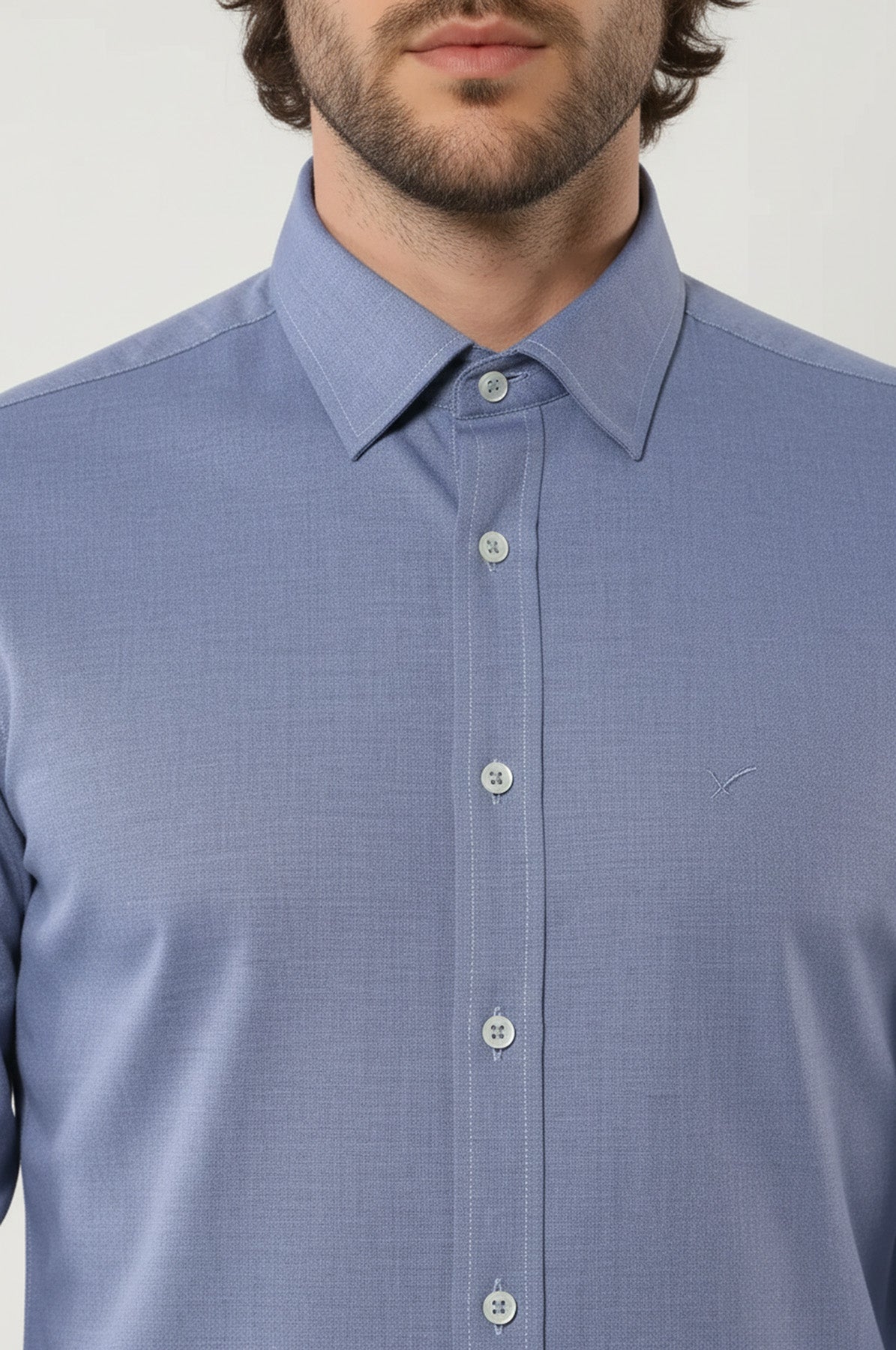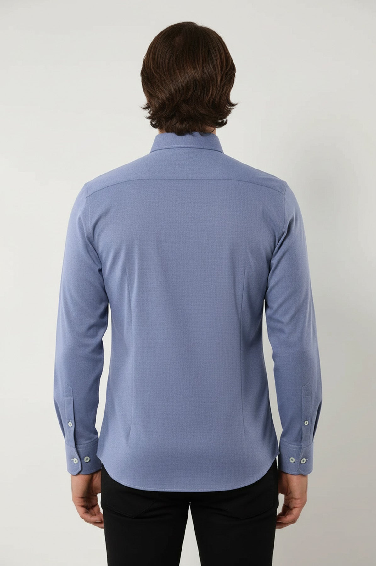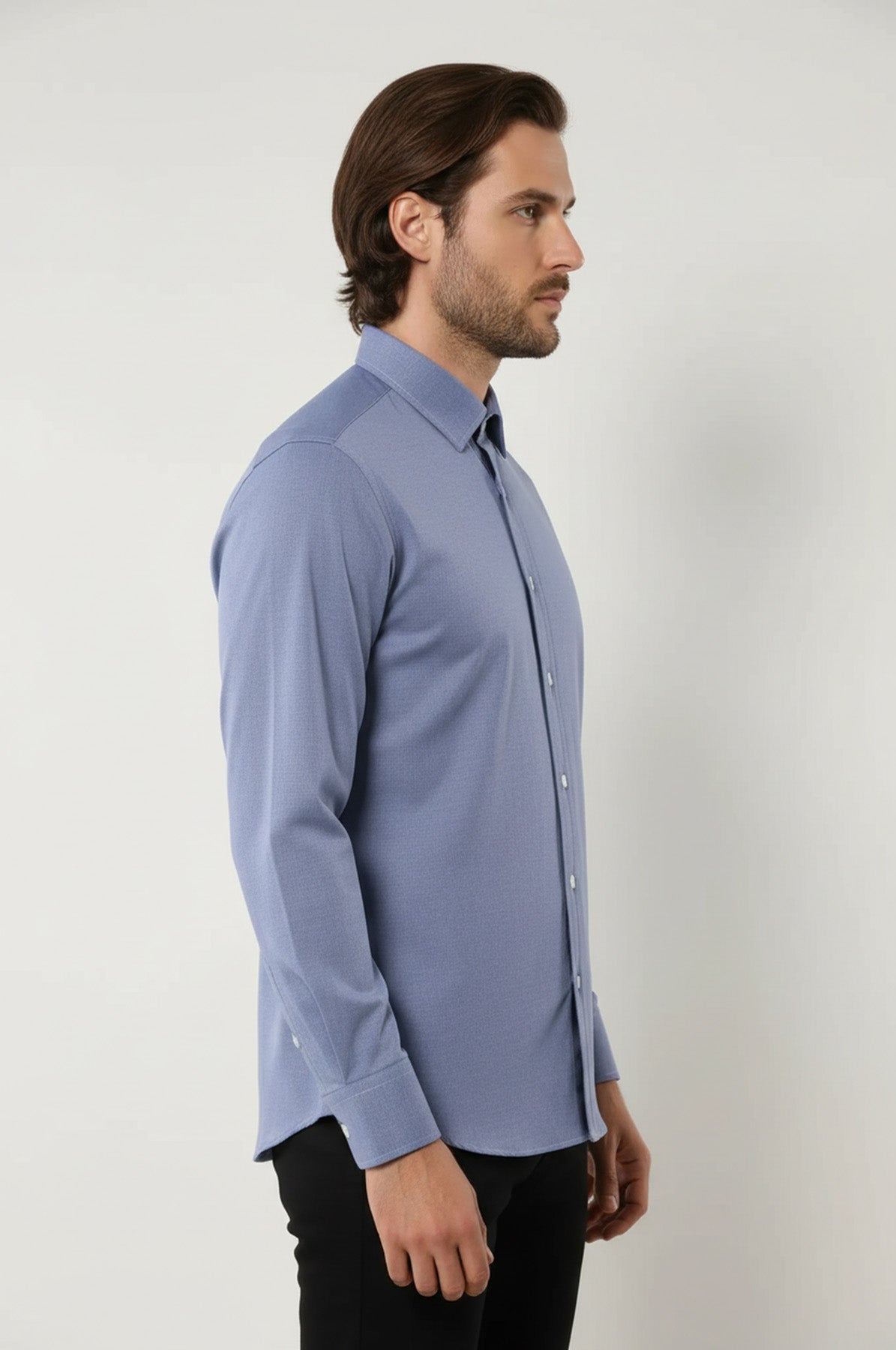 Keten kumaş ile tasarlanmış, dar kesim, uzun kollu, cepsiz düğmeli yaka detaylı mavi renk slim fit erkek gömlek modelidir.