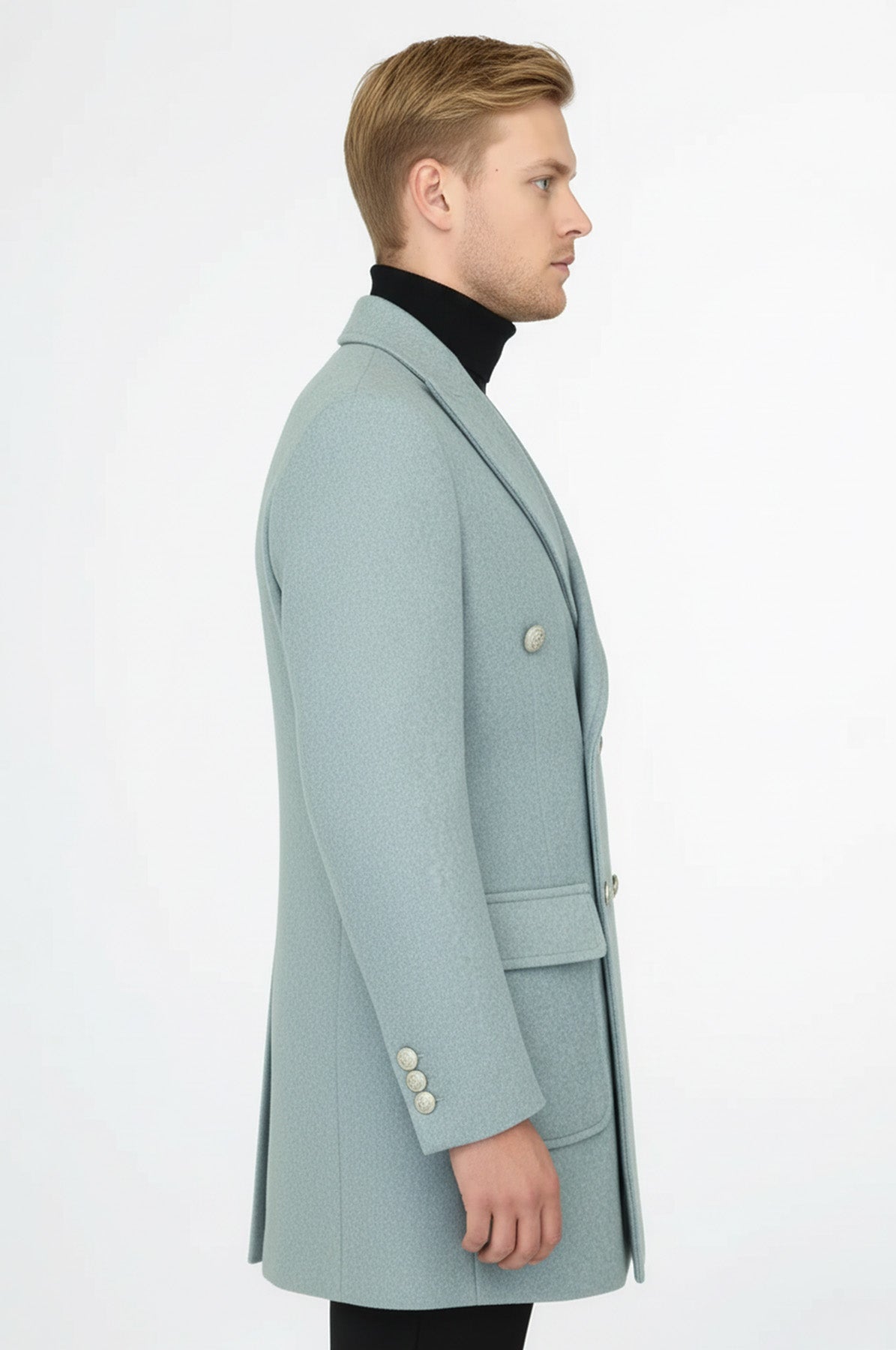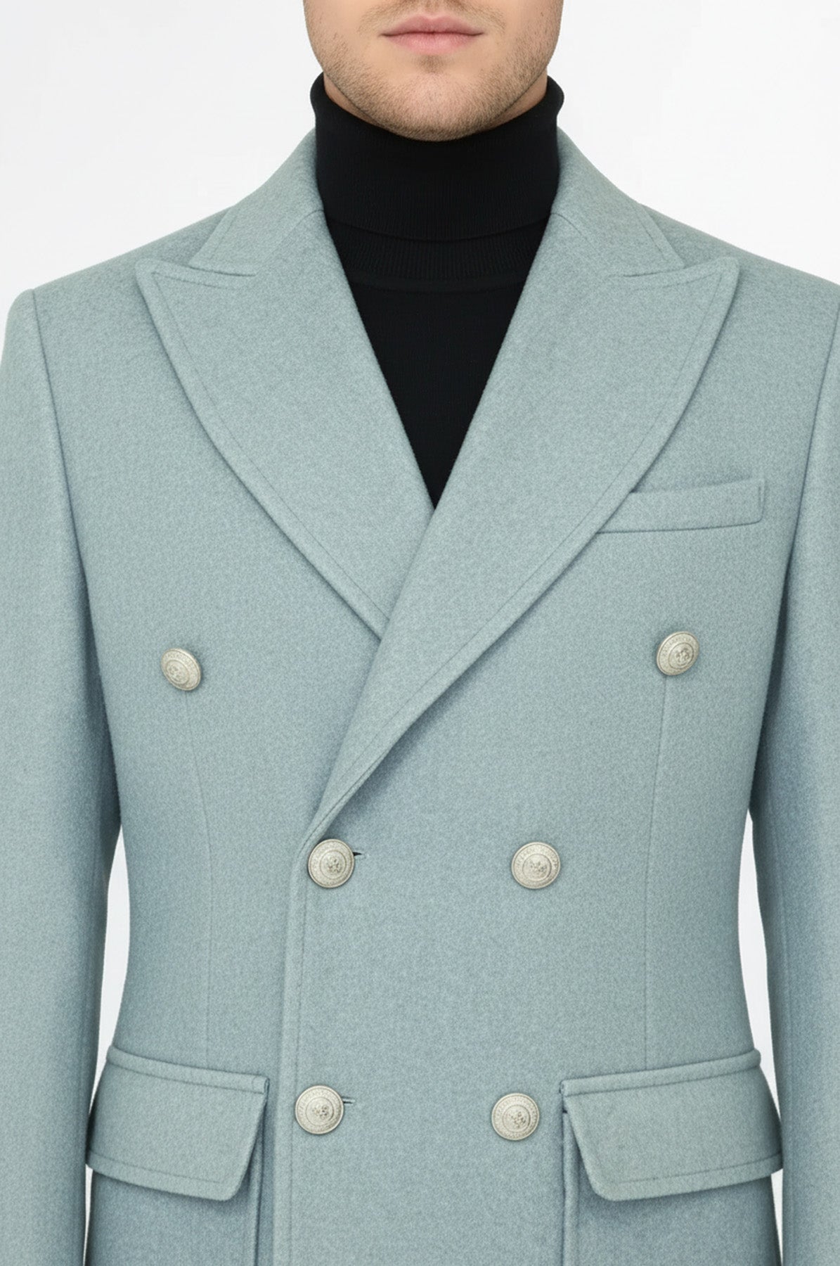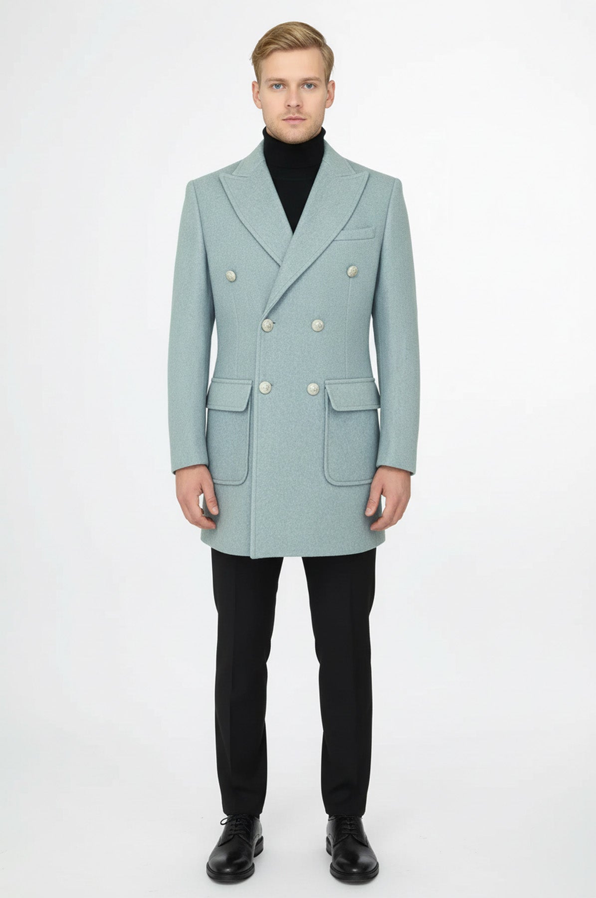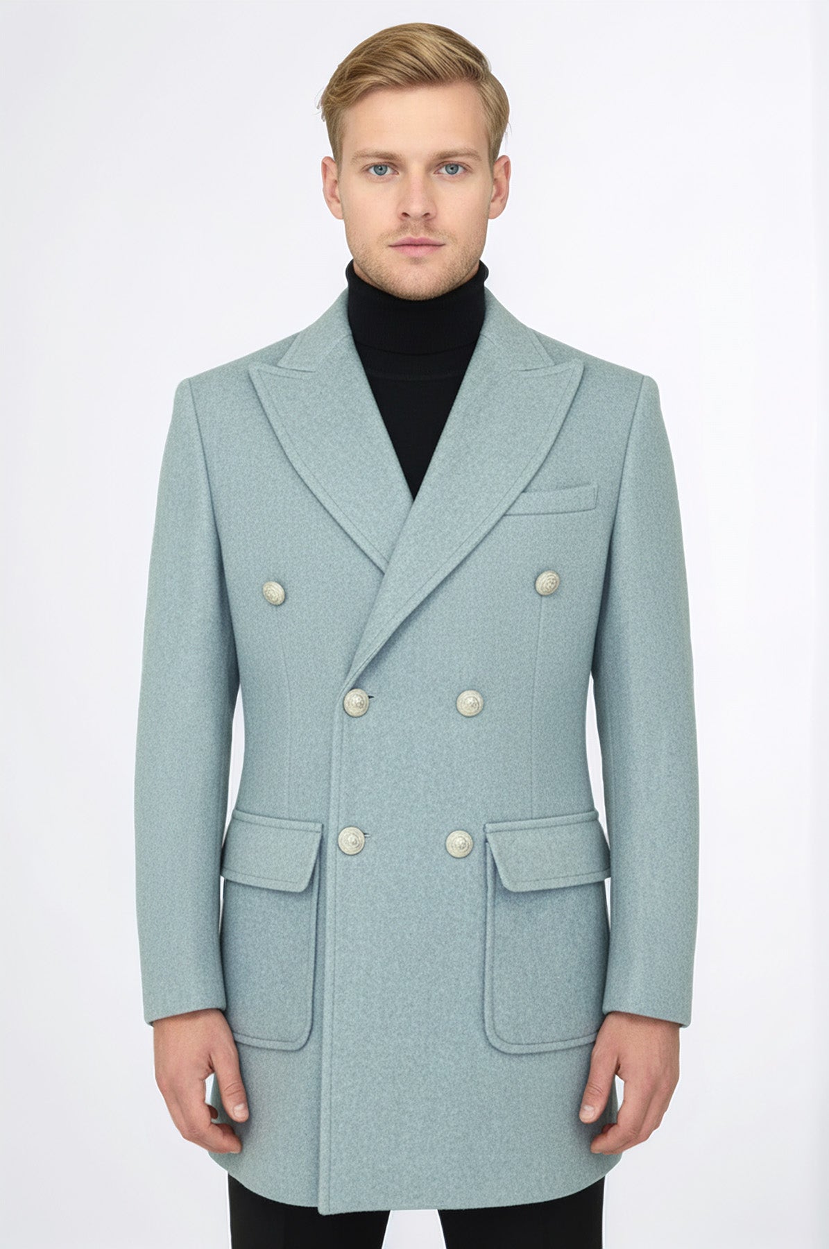 Metal Düğmeli Yün Kaşe Açık Mavi Erkek Kruvaze Kaban - Wessi