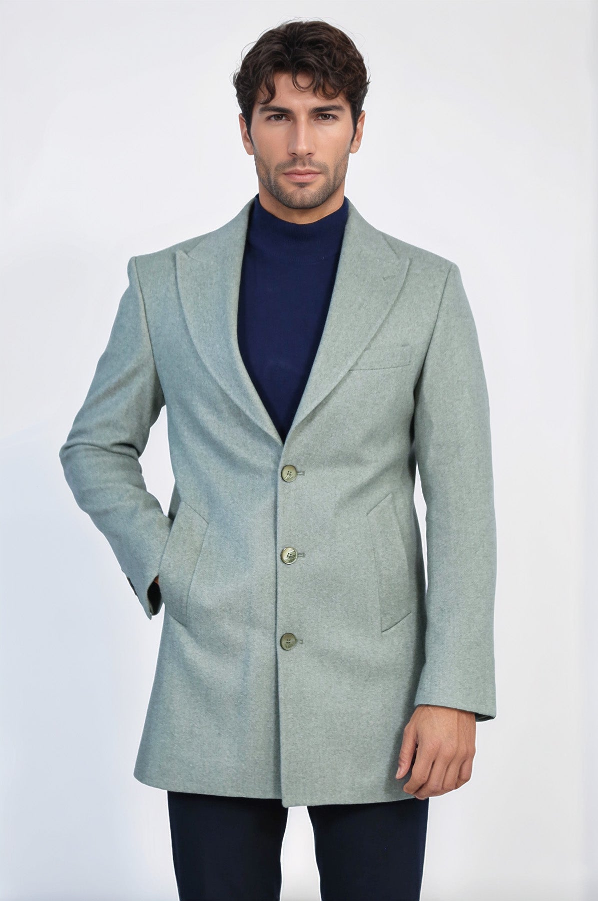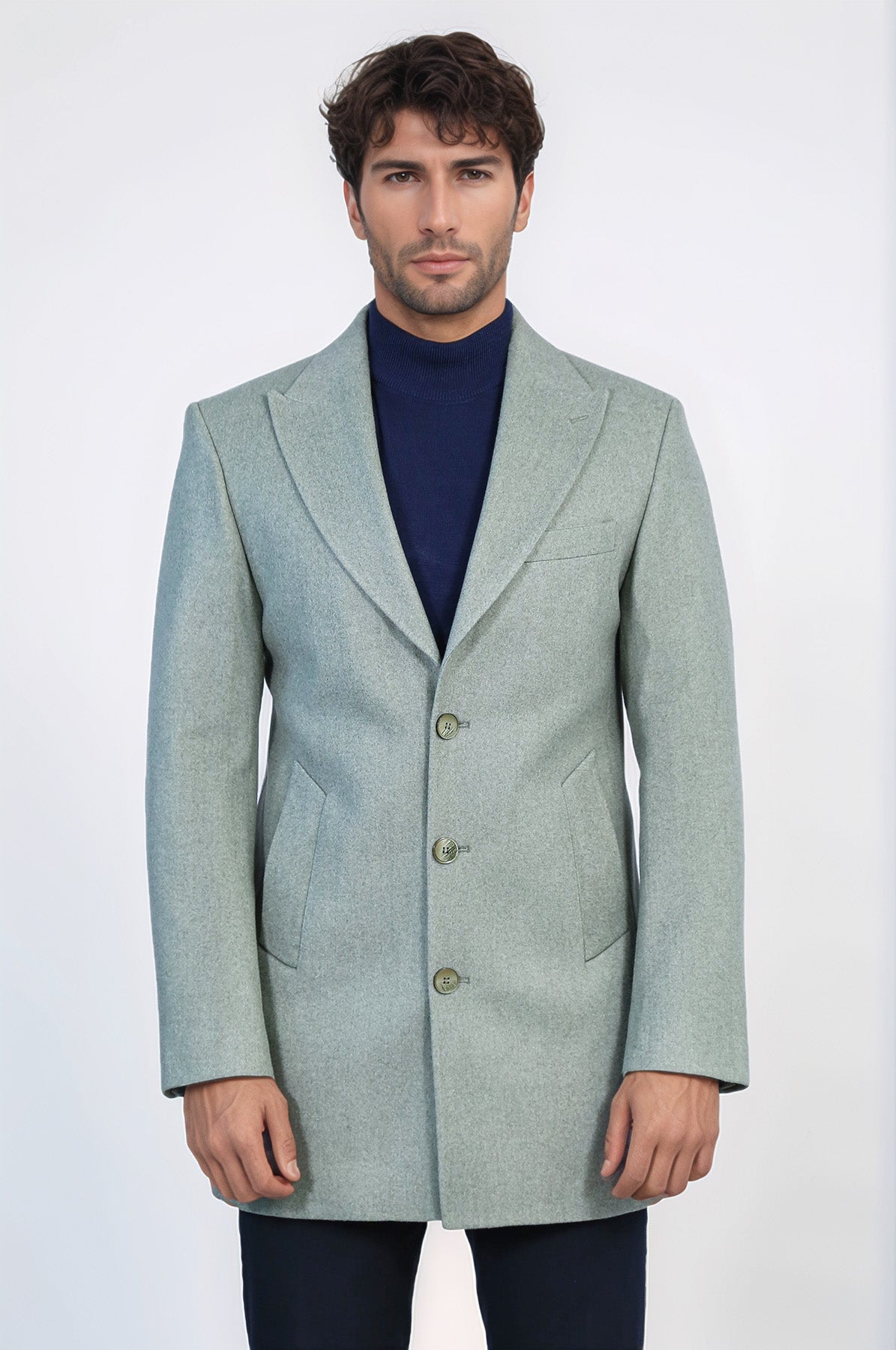 Petrol Yeşili Geniş Yaka Yün Erkek Kaban - Wessi