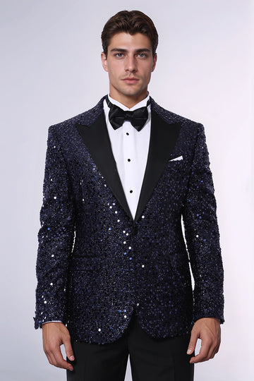 Pullu ışıltılı desenli kumaş ile tasarlanmış slim-fit, tek düğmeli sivri yakalı lacivert smokin ceket modelidir. Fiyata sadece ceket dahildir.