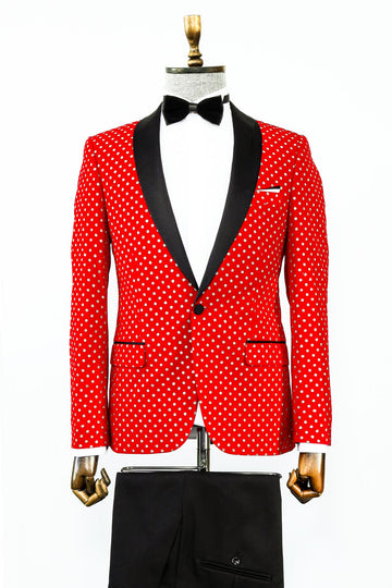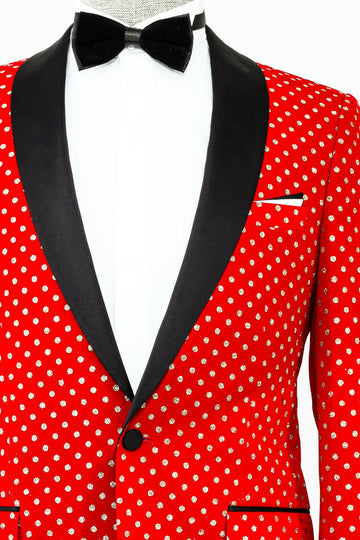 - Saten şal yaka detayına sahip, zarif nokta desenleriyle zenginleştirilmiş kırmızı smokin ceketi,