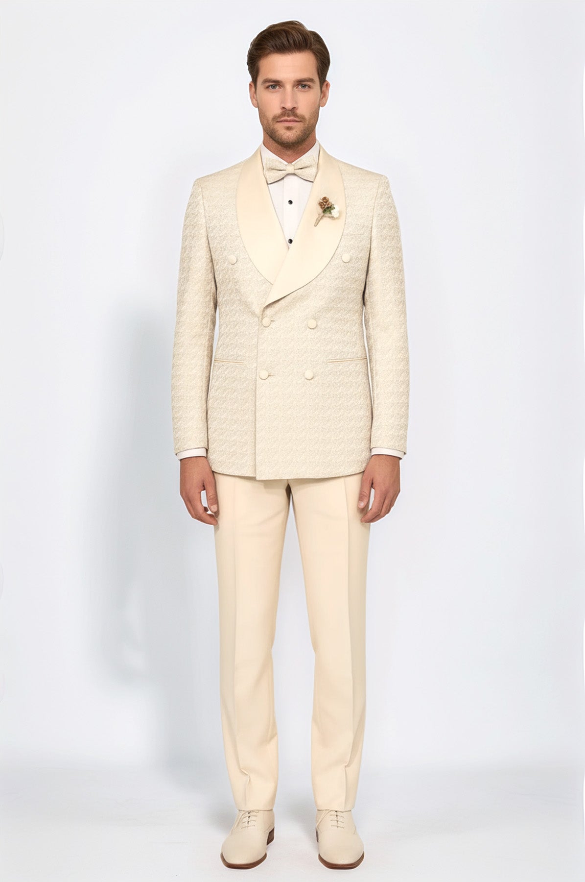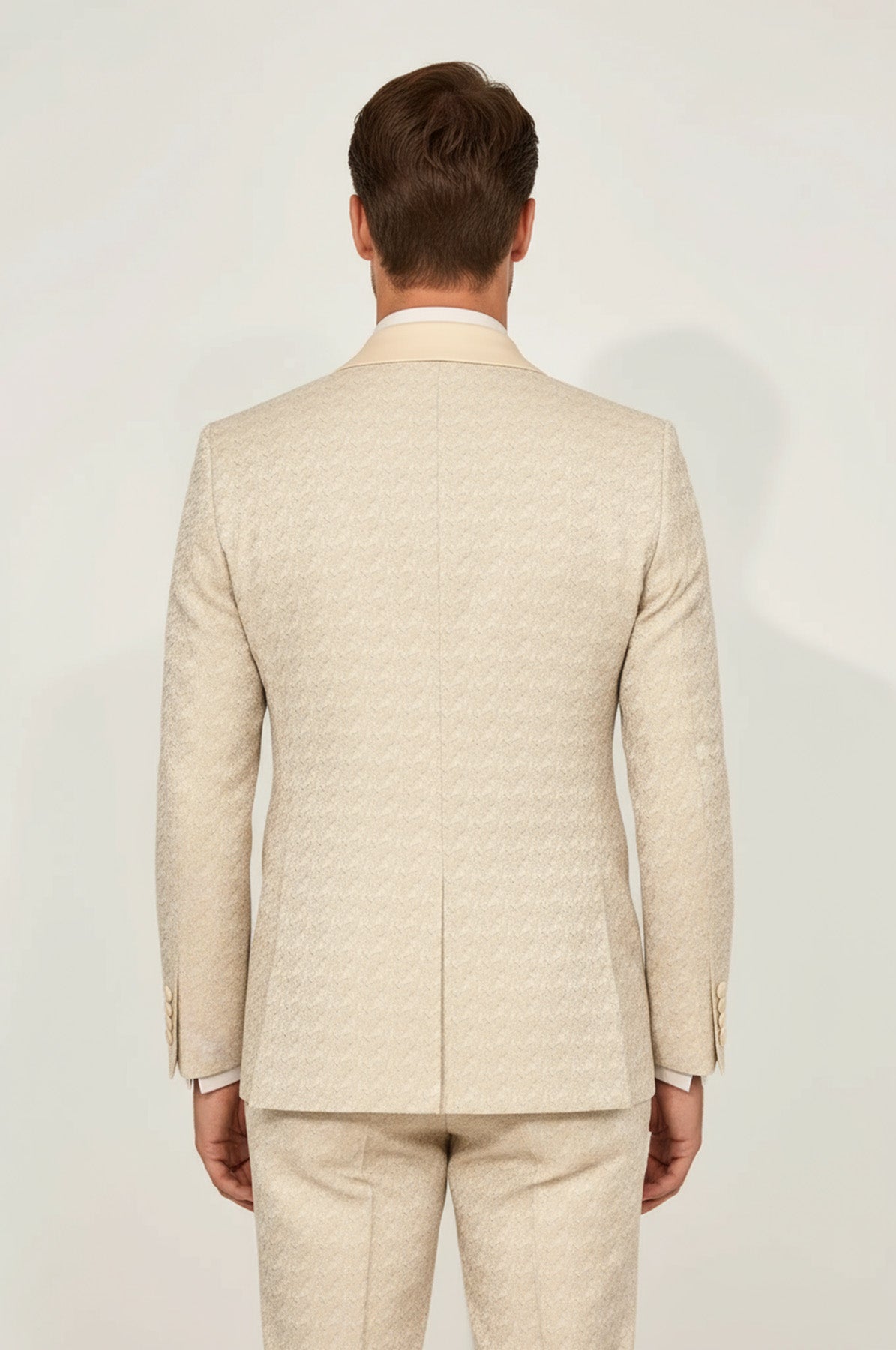 Saten Yaka Kendinden Desenli Kruvaze Bej Erkek Damatlık Takım Elbise - Wessi