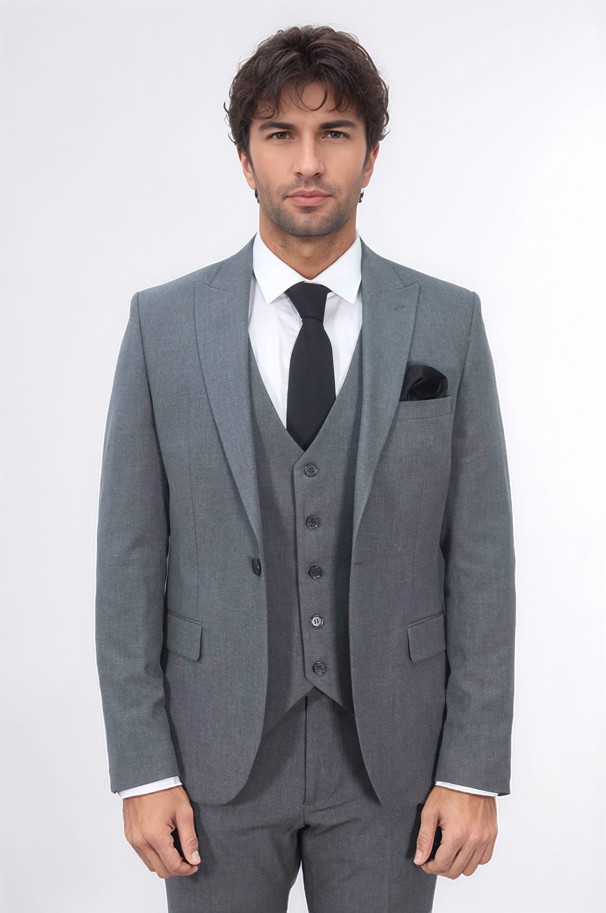 Tek Düğmeli Slim Fit Koyu Gri Yelekli Erkek Takım Elbise - Wessi