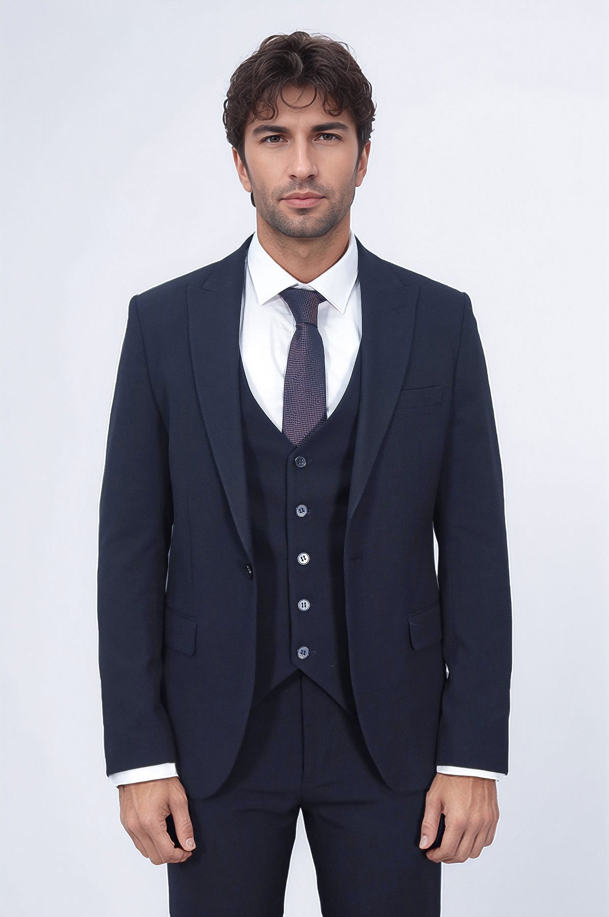 Gardırobunuzu Üç Parçalı Slim Fit Tek Düğmeli Lacivert Erkek Takımımız ile güncelleyin. Herhangi bir resmi etkinlik için mükemmel olan bu takım, şık ve modern bir görünüm için hassasiyetle tasarlanmıştır. Tek düğme kapaması ve slim fit tasarımı stil oyununuzu yükseltirken, lacivert renk gardırobunuza çok yönlülük katar. Bu ustalıkla dikilmiş takım ile bir ifade bırakın ve güven saçın.