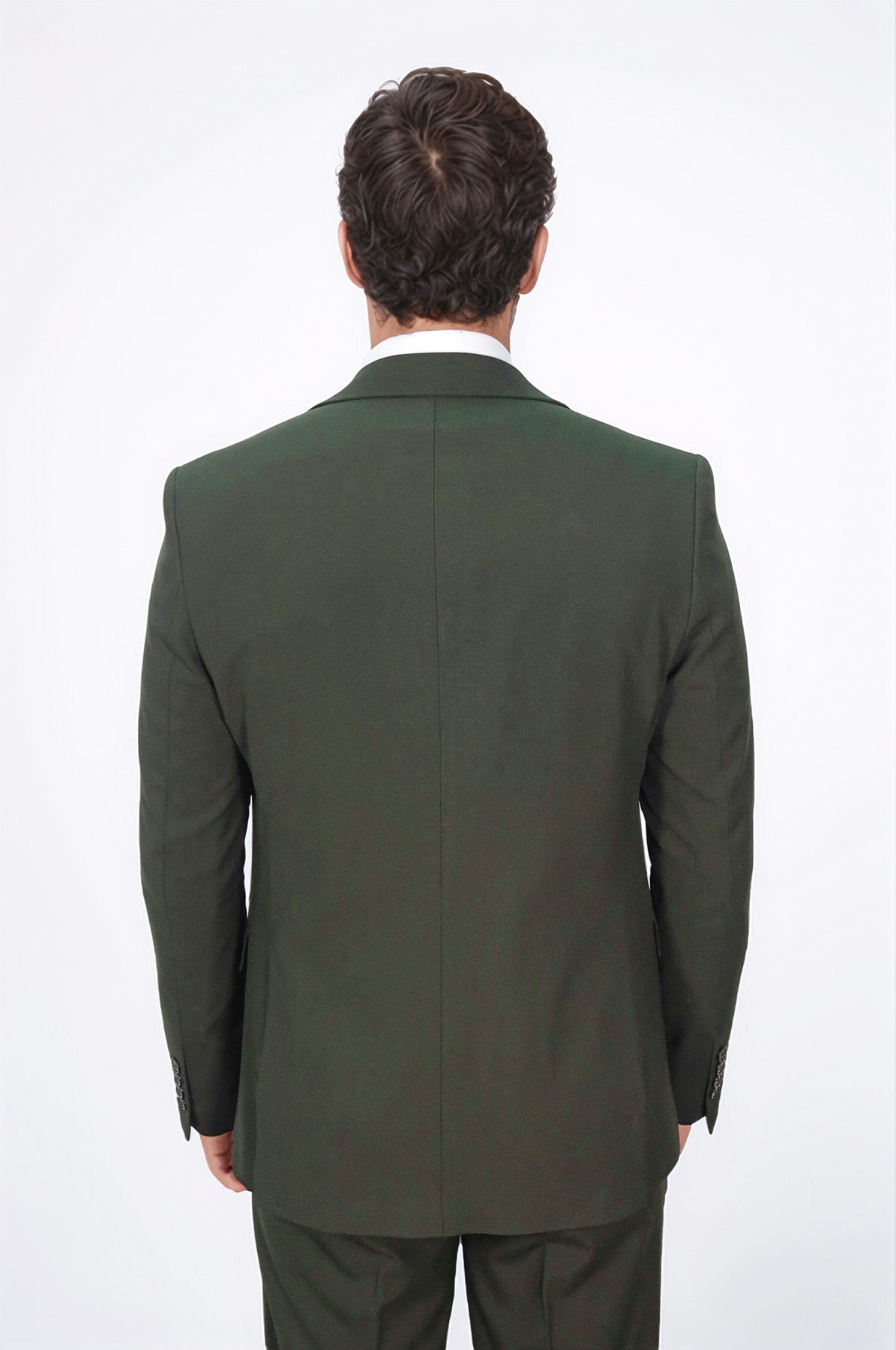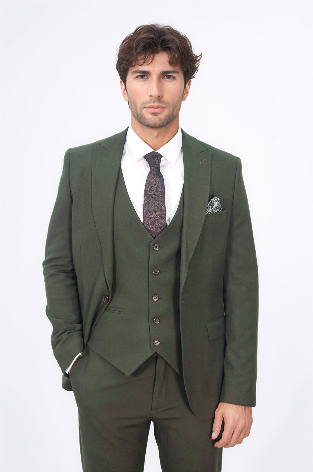 Yeşil takım elbise ile iş toplantılarından özel davetlere kadar her ortamda şık ve modern görünün. Tek düğme, dik yaka, 3 parça tasarım ve slim fit kesimiyle sofistike bir takım.