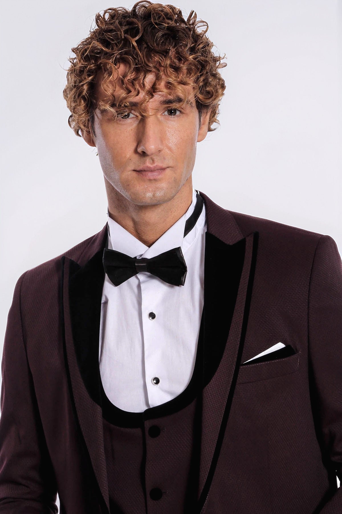 Velvet Yaka Yelekli Desenli Bordo Erkek Damatlık - Wessi