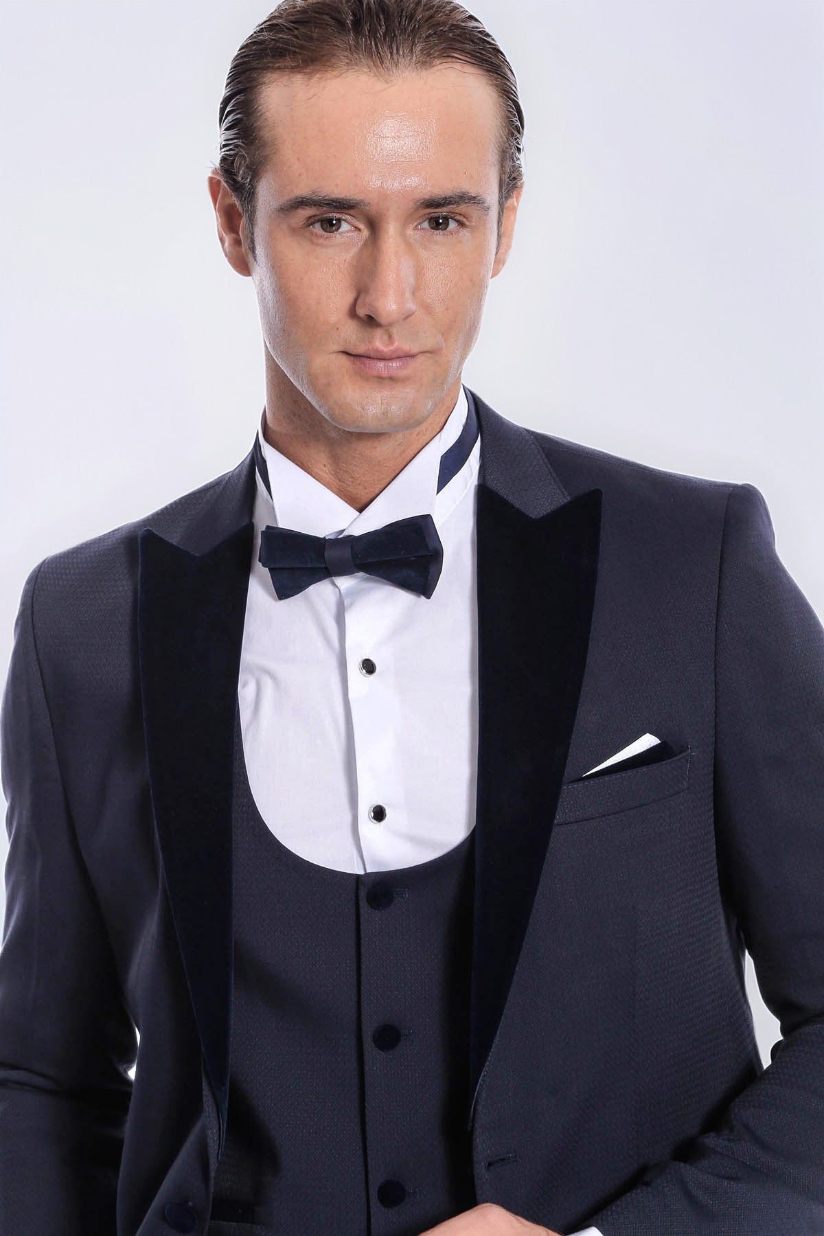 Velvet Yakalı Slim Fit Lacivert Erkek Damatlık - Wessi