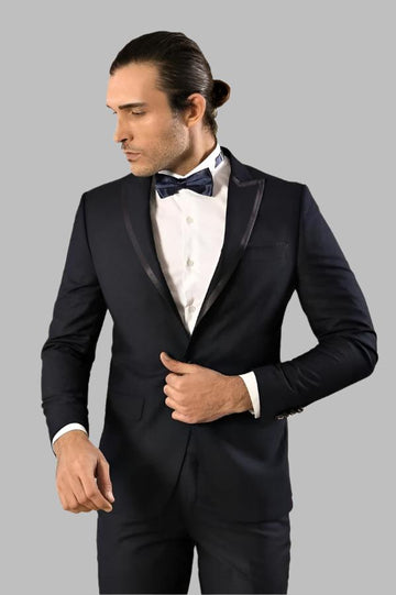 Modern damatlık takım elbise modellerinden biri olan bu takım elbise iki parçadan oluşuyor. Şık ve güzel görünüm sunuyor. Desensiz lacivert renkli ceket ilk parçayı oluşturuyor. Çıkarılabilen şal yakası bulunan bu ceket modelinin yakasında iki adet saten şerit bulunmaktadır. Çift düğmesi olan bu ceketin üç adet cebi bulunuyor. Lacivert renkli, rahat kesimli olan pantolon takım elbisenin ikinci parçasını oluşturuyor. Slim fit kalıptan oluşan ceket ve pantolon vücudunuzu saracaktır.